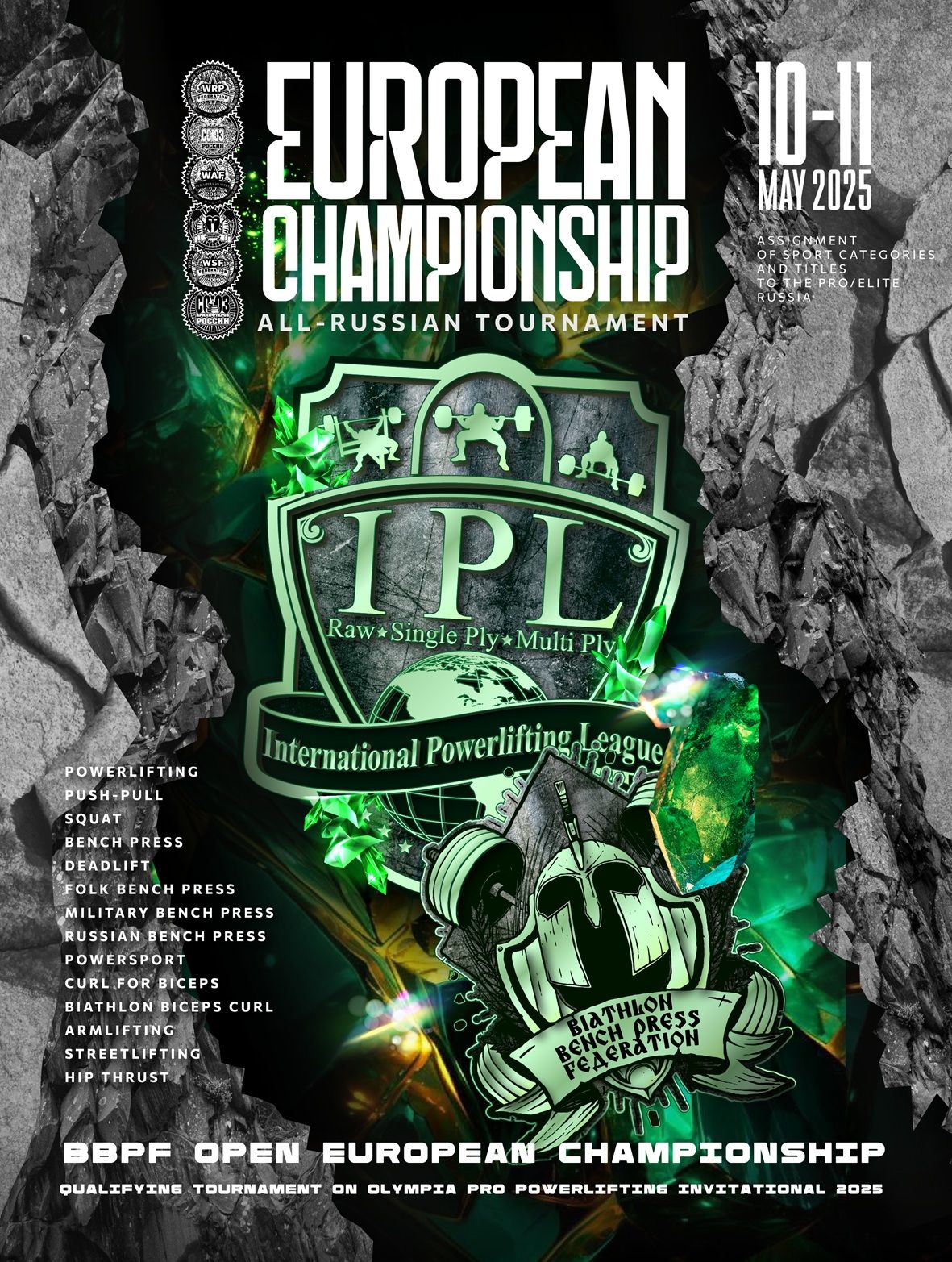 Открытый Чемпионат Европы по пауэрлифтингу, силовому двоеборью, жимовому двоеборью, приседаниям, жиму лежа и становой тяге по версиям IPL/СПР/ФЖД, Отборочный турнир на Olympia Pro Powerlifting Invitational 2025, Всероссийский турнир по народному жиму, военному жиму, русскому жиму, пауэрспорту, строгому подъему на бицепс, экстремальному подъему на бицепс, классическому подъему на бицепс, бицепсовому двоеборью, армлифтингу, стритлифтингу и hip thrust по версиям СПР/WRPF/WAF/САР/WSF, Россия / Московская область, Долгопрудный, 10-11.05.2025 (присвоение до PRO / Элиты включительно)