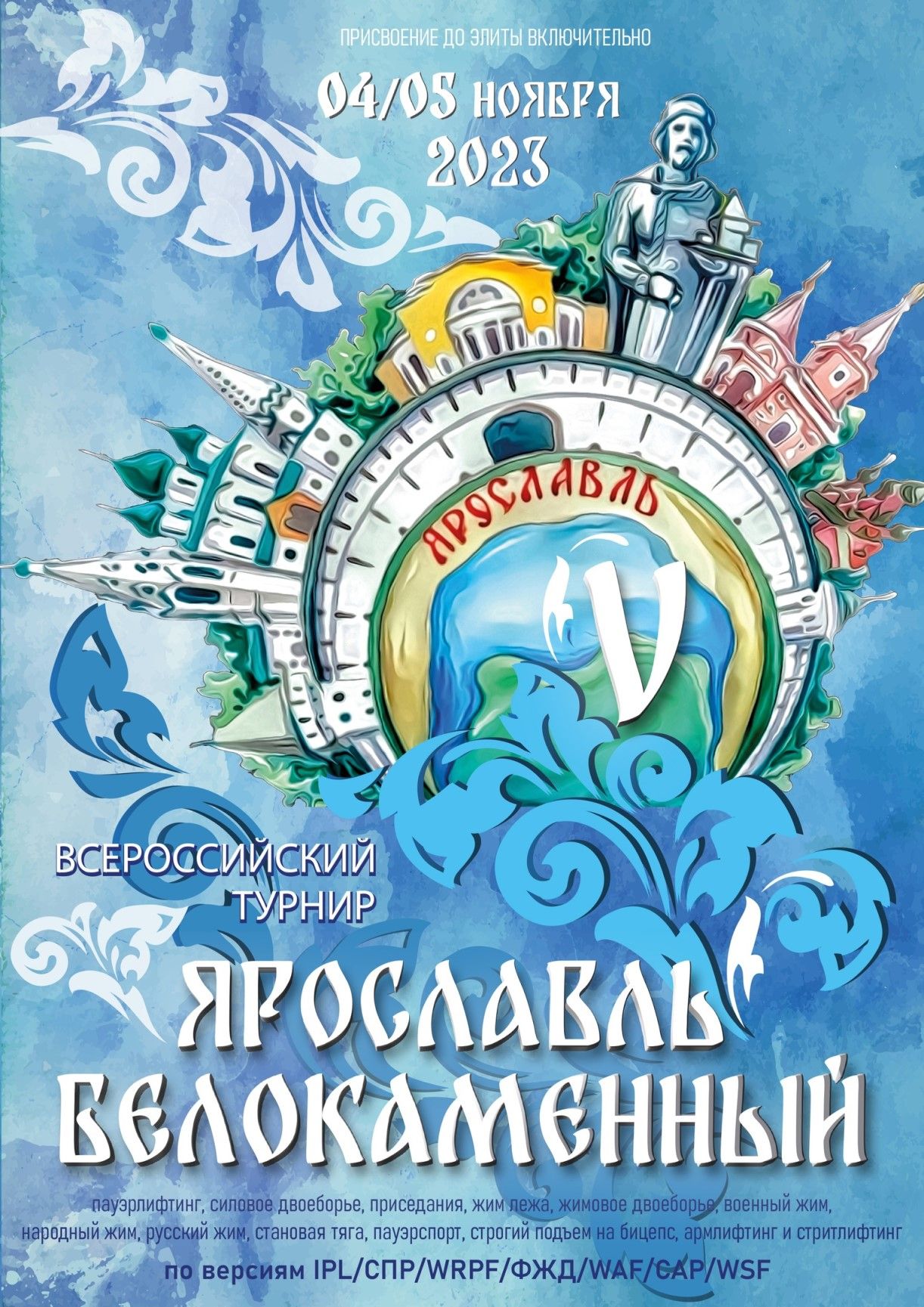Всероссийский турнир «Ярославль белокаменный V» по пауэрлифтингу, силовому двоеборью, приседаниям, жиму лежа, жимовому двоеборью, военному жиму, народному жиму, русскому жиму, становой тяге, пауэрспорту, строгому подъему на бицепс, армлифтингу, стритлифтингу и hip thrust по версиям IPL/СПР/WRPF/ФЖД/WAF/САР/WSF, Россия / Ярославль, 11-12.11.2023 (присвоение до Элиты / PRO включительно)