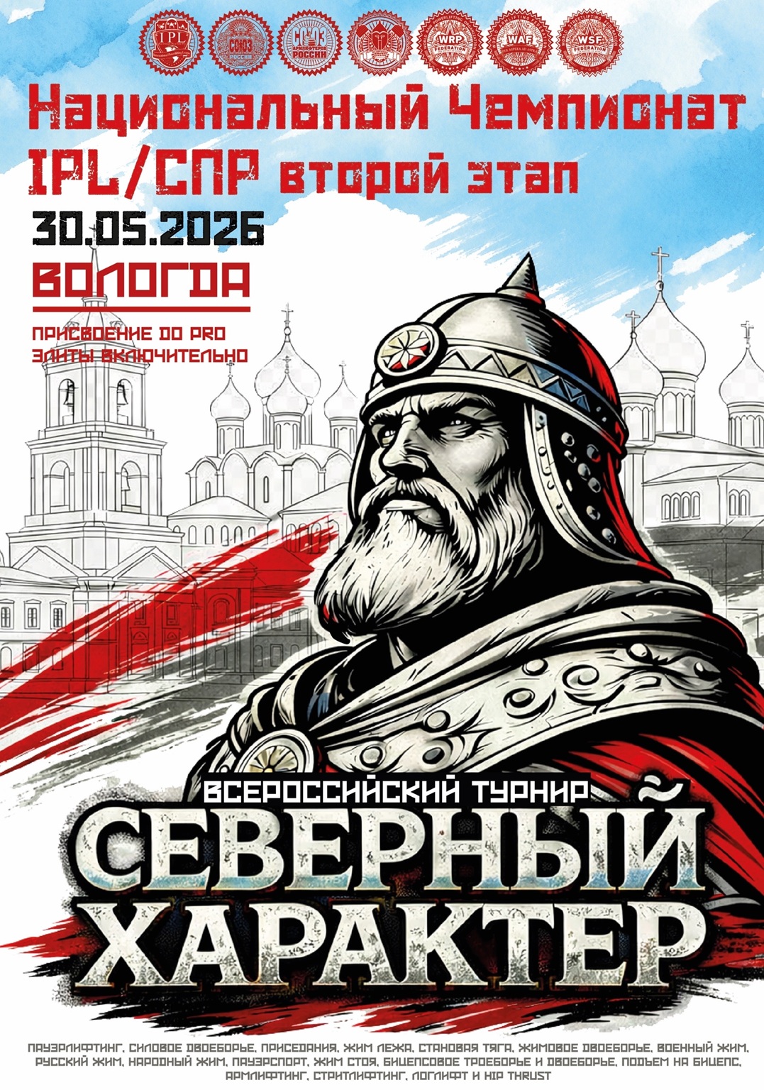 Второй этап Национального Чемпионата по пауэрлифтингу, силовому двоеборью, приседаниям, жиму лежа и становой тяге по версиям IPL/СПР, а также Всероссийский турнир «Северный характер. Вологда» по жимовому двоеборью, военному жиму, русскому жиму, народному жиму, пауэрспорту, жиму стоя, бицепсовому троеборью и двоеборью, подъему на бицепс, армлифтингу, стритлифтингу, логлифту и hip thrust по версиям WRPF/ФЖД/СПР/WAF/САР/WSF, Россия / Вологодская область, Вологда, 30.05.2026 (присвоение до PRO / Элиты включительно)